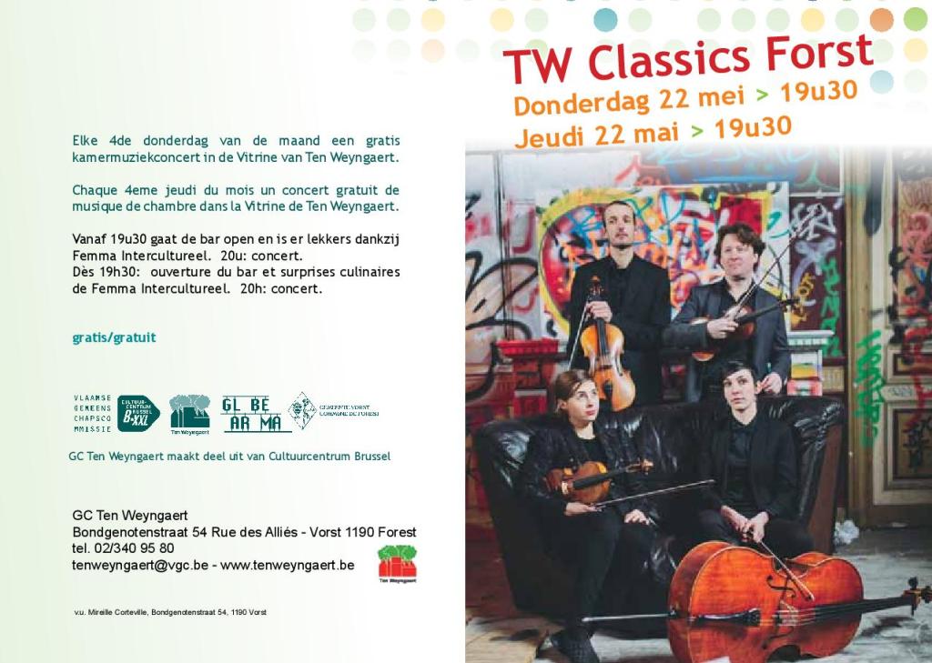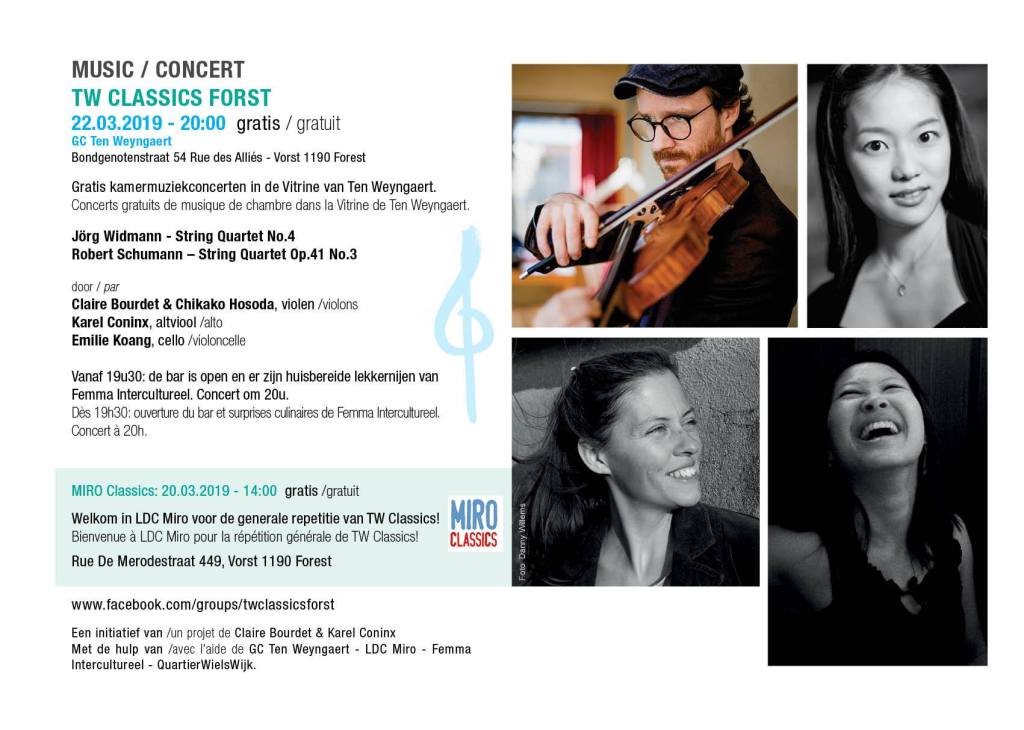 [NL] – … is een gratis kamermuziekreeks, in GC Ten Weyngaert Vorst (Brussel) sinds 2013. Ontdek hier info over onze concerten, over de artiesten, of over onze samenwerkingen, en vooral : kom eens een concert bijwonen!