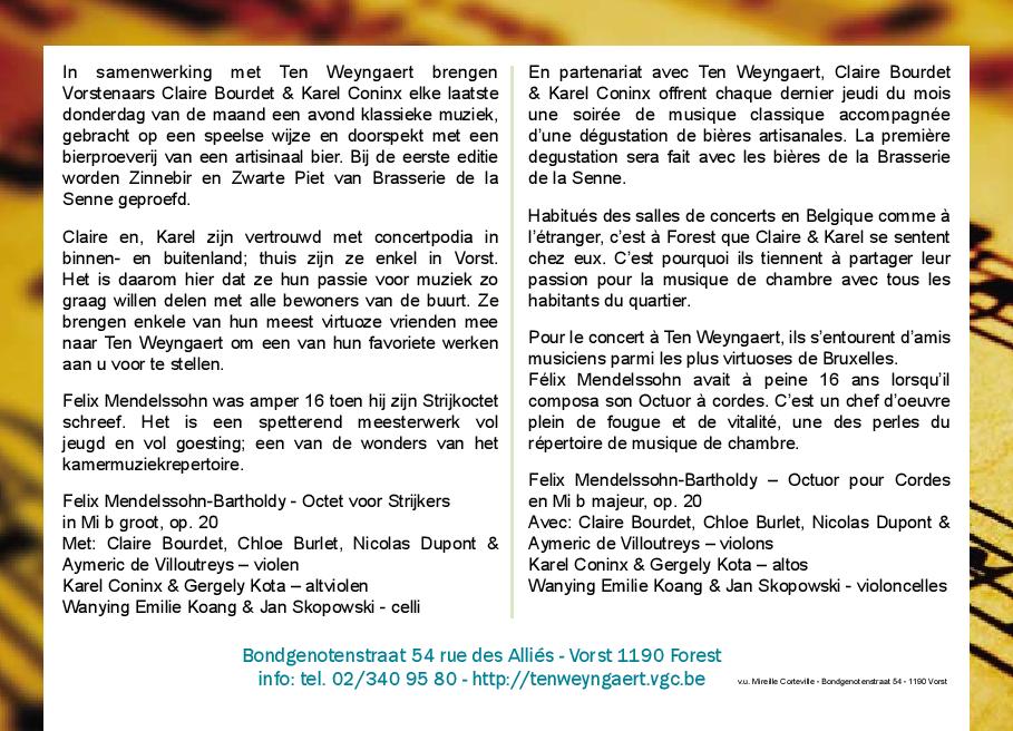 Claire Bourdet, Aymeric de Villoutreys, Chloé Burlet & Nicolas Dupont - violen Karel Coninx & Jonathan Ponet - altviolen Wanying Emilie Koang & Jan Skopowski - celli